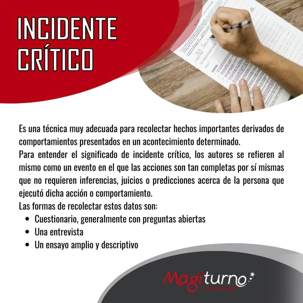 Incidente crítico: es una técnica muy adecuada para recolectar hechos importantes derivados de comportamientos presentados en un acontecimiento determinado.