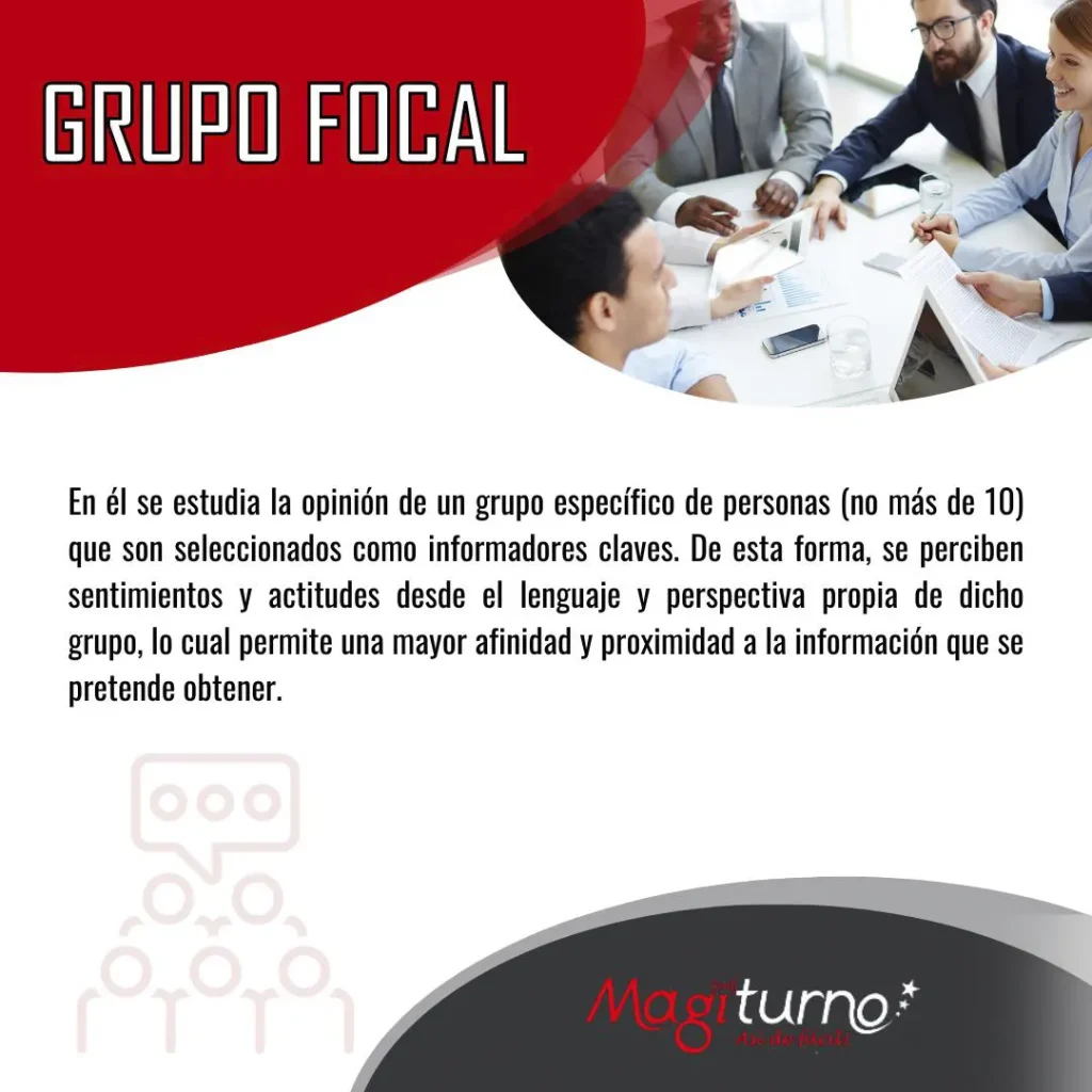 Grupo focal: En él se estudia la opinión de un grupo específico de personas (no más de 10) que son seleccionados como informadores claves. De esta forma, se perciben sentimientos y actitudes desde el lenguaje y perspectiva propia de dicho grupo, lo cual permite una mayor afinidad y proximidad a la información que se pretende obtener.