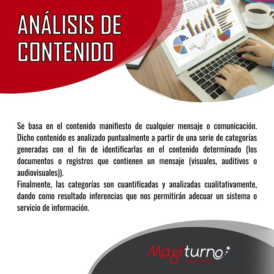 Análisis de contenido: Se basa en el contenido manifiesto de cualquier mensaje o comunicación. Dicho contenido es analizado puntualmente a partir de una serie de categorías generadas con el fin de identificarlas en el contenido determinado (los documentos o registros que contienen un mensaje (visuales, auditivos o audiovisuales)).