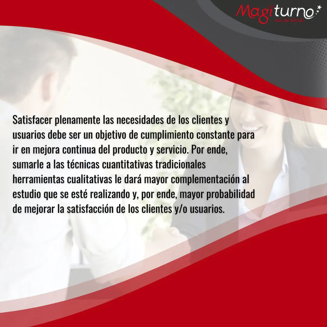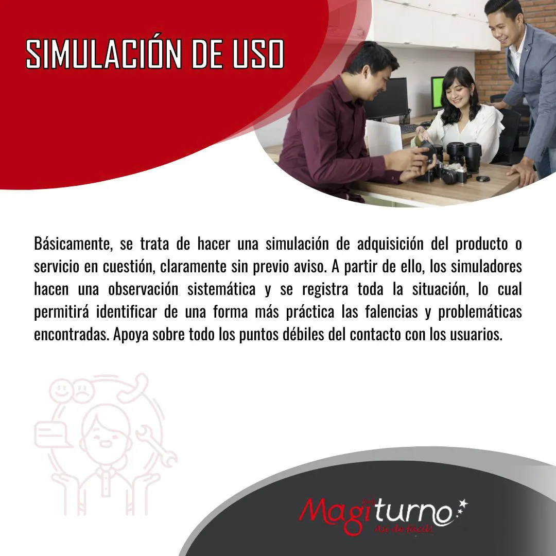 Simulación de uso: Básicamente, se trata de hacer una simulación de adquisición del producto o servicio en cuestión, claramente sin previo aviso. A partir de ello, los simuladores hacen una observación sistemática y se registra toda la situación, lo cual permitirá identificar de una forma más práctica las falencias y problemáticas encontradas. Apoya sobre todo los puntos débiles del contacto con los usuarios. Satisfacer plenamente las necesidades de los clientes y usuarios debe ser un objetivo de cumplimiento constante para ir en mejora continua del producto y servicio. Por ende, sumarles a las técnicas cuantitativas tradicionales herramientas cualitativas le dará mayor complementación al estudio que se esté realizando y, por ende, mayor probabilidad de mejorar la satisfacción de los clientes y/o usuarios.