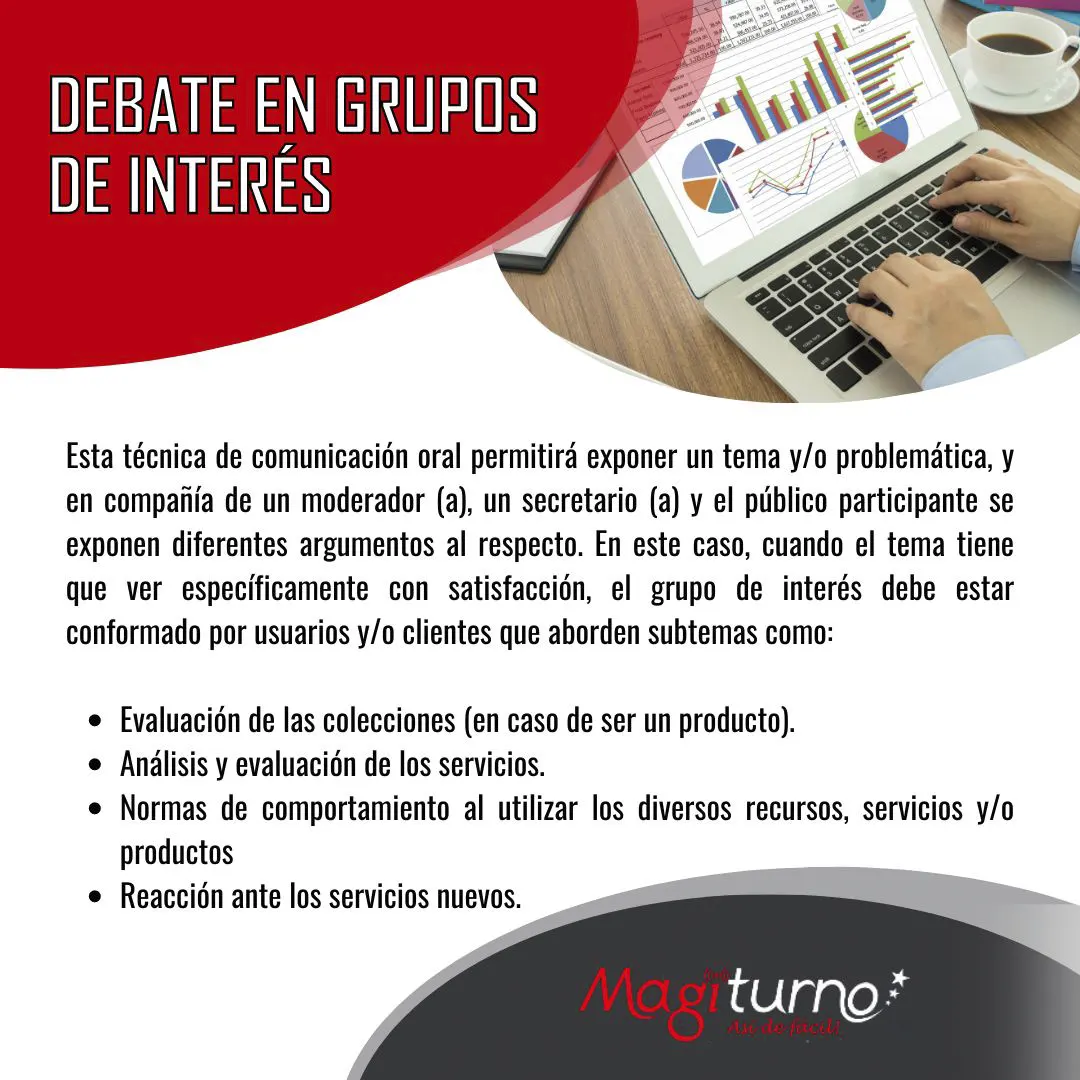 Debate en grupos de interés: Esta técnica de comunicación oral permitirá exponer un tema y/o problemática, y en compañía de un moderador (a), un secretario (a) y el público participante se exponen diferentes argumentos al respecto. En este caso, cuando el tema tiene que ver específicamente con satisfacción, el grupo de interés debe estar conformado por usuarios y/o clientes que aborden subtemas como:
